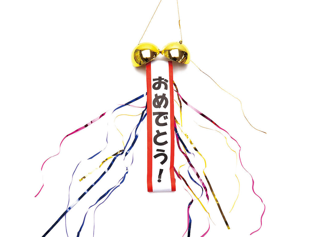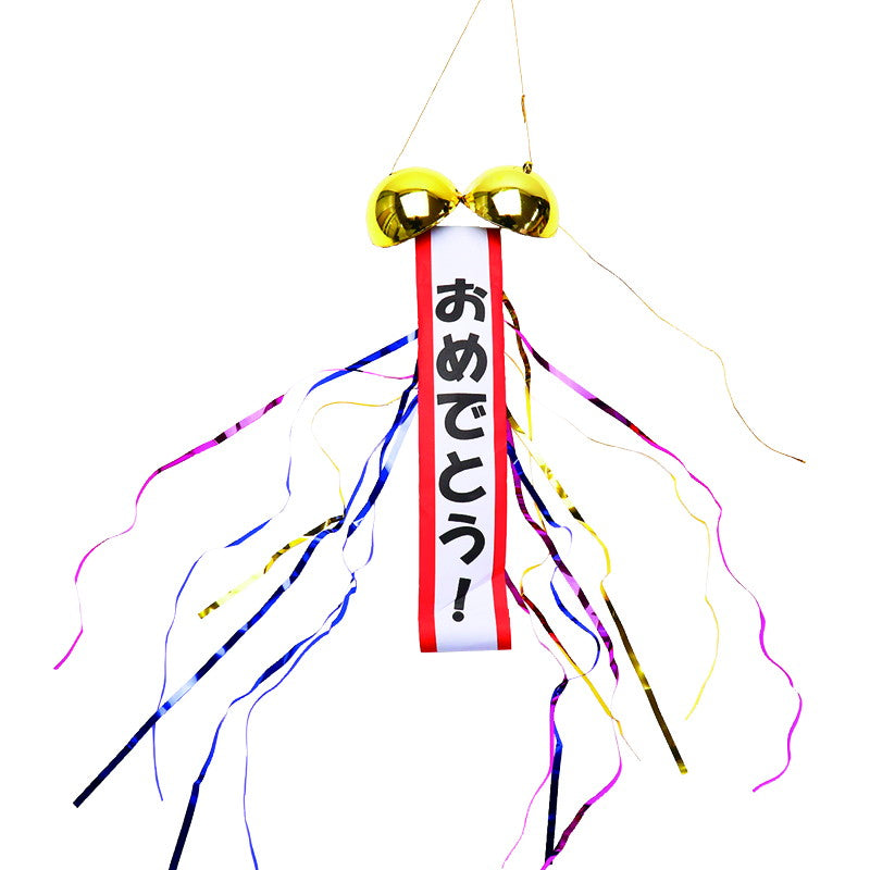- 商品説明:高い場所に固定し、球から出ている紐を引っ張ると「おめでとう」の幕が垂れ下がります。