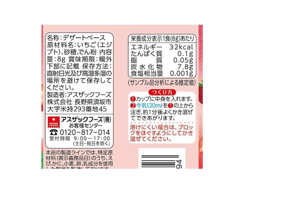 特徴:冷たい牛乳を注いで混ぜるだけで、ザク切りいちご果肉がたっぷり入ったいちごミルクができあがります。フリーズドライ製法で、いちごのおいしさをそのまま閉じこめました。
