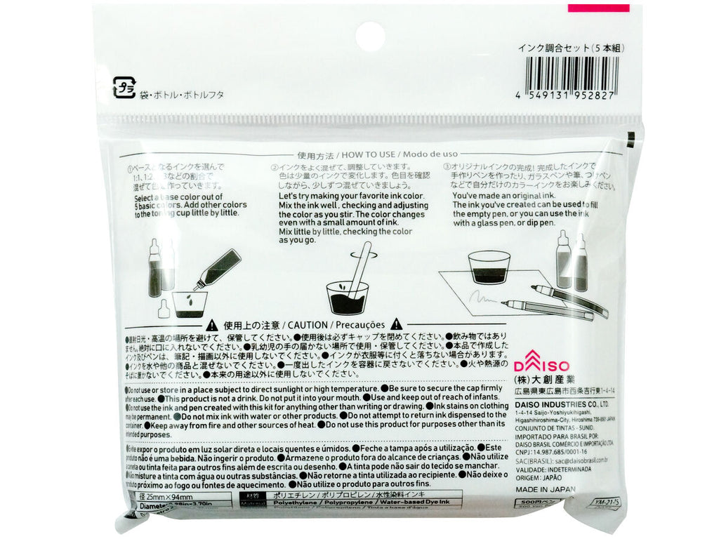 - 商品説明:①ベースとなるインクを選んで1:1、1:2、1:3、などの割合で混ぜて色を作っていきます。②インクをよく混ぜて、調整していきます。色は少量のインクで変化します。色目を確認しながら、少しずつ混ぜていきましょう。_③オリジナルインクの完成!完成したインクで手作りペンを作ったり、ガラスペンや筆、つけペンなどで自分だけのカラーインクをお楽しみください。_直射日光・高温の場所を避けて、保管してください。使用後は必ずキャップを閉めてください。●乳幼児の手の届かない場所で使用・保管してください、●インクが衣服等に付くと落ちない場合があります_●火や熱源のそばに置かないでください、●本来の用途以外に使用しないでください、●飲み物ではありません。絶対に口に入れないでください、●_本品で作成したインク及びペンは、筆記・描画以外に使用しないでください、●インクを水や他の商品と混ぜないでください、●一度出したインクを容器に戻さないでください。