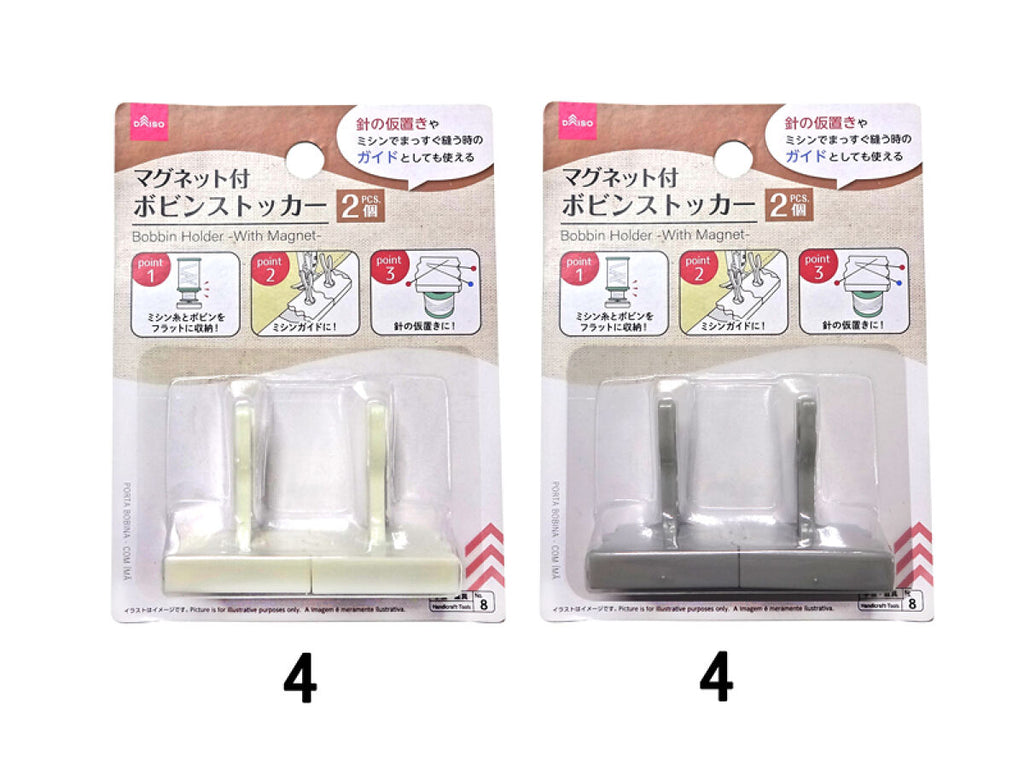 - 商品説明:針の仮置きや、ミシンでまっすぐ縫う時のガイドとしても使えるミシン糸とボビンをフラットに収納!ミシンガイドに!針の仮置きに!ミシン糸と下糸のセット収納道具として針の仮置きや、ミシンの直線縫いのガイドにミシン糸と下糸ボビンをセットにして収納できるボビンストッカーに、マグネットを付けた多機能商品です。①下糸ボビンの糸をミシン糸のボビン穴に入れます。②①の二つのボビン穴の位置を重ね、図のように上からゆっくり差し込みます。※先端の幅はボビン穴より少し大きめですので、先端部が穴に入ったことを確認してから差し込んでください。③セット完了家庭用ミシンで使用するボビン以外のサイズは使用出来ない場合があります。注意してください。ミシンガイドとして使用する場合、ミシンの種類によっては使用出来ない場合があります。また、使用する際は、ボビンをセットしていない状態で使用してください。無理な力を加えないでください。磁気に影響を受けるものに近づけないでください。使用上、バネの根本が白くなったり、バネの力が弱くなる場合があります。直射日光・高温多湿の場所を避けて、使用・保管してください。お子様の手の届かない場所で使用・
