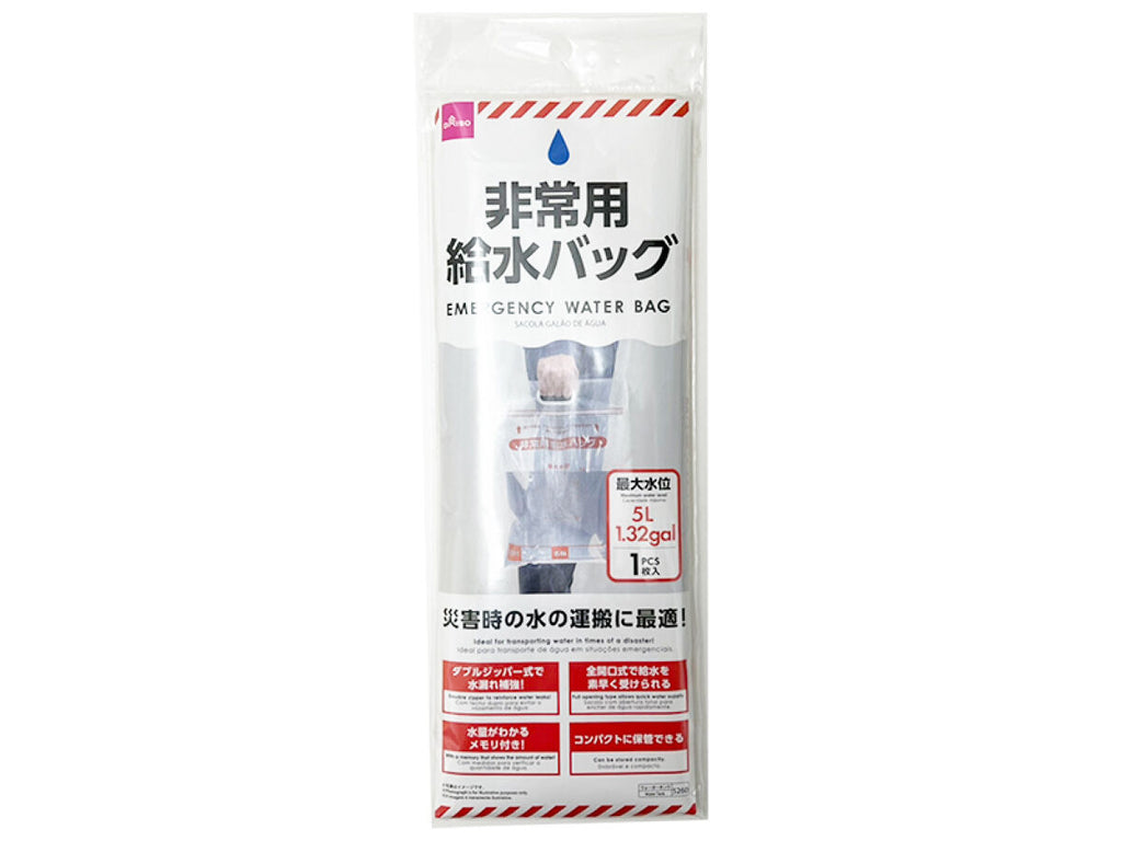 - 商品説明:災害時の水の運搬に最適!_ダブルジッパ式で水漏れ補強!_前開口式で給水を素早く受けられる_水量がわかるメモリ付き!_コンパクトに保管できる最大水位5L開ける時は、ダブルジッパの根元をしっかり持ちゆっくり開けてください。_蛇口に合わせてジッパ開口部を調整し、水を入れることができます。_閉じる時は、空気を抜きながらダブルジッパを指で押さえて1列ずつ端から端までしっかり閉じてください。_バッグから別の容器に水を注ぐ時は、ダブルジッパの端部分(2列とも)を少し開き、ゆっくり注いでください。本品は水を保存する袋ではありません。水を入れた状態での保管は避けてください。_本品は水の変質を防止するものではなく、密閉を保証するものではありません。_ダブルジッパーで水漏れ補強をしていますが、若干にじみ出る可能性があります。_ジッパー部分を折り曲げる等、変形させないでください。水漏れの原因となります。_尖ったものや鋭利なものに触れさせないでください。_無理な力を加えたり、強く引っ張ったりしないでください。_熱湯を入れないでください。_水が入っている状態で袋の上から押さないでください。水が出る可能性があります。_お子様の手