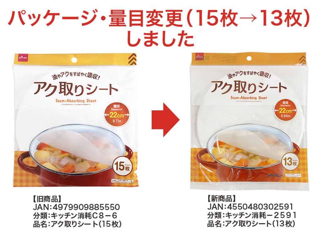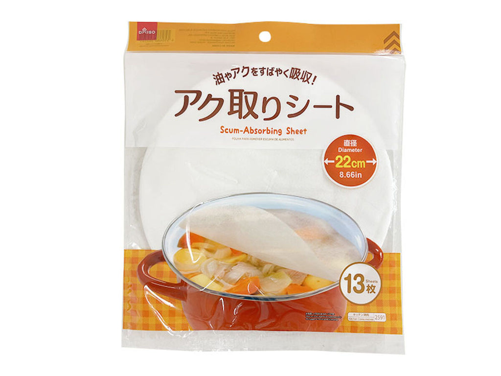 - 商品説明:油やアクをすばやく吸収! ※写真・イラストはイメージです。直径:22cm(13枚) シートの浮き上がりを防ぐ、スリット入り 油やアクをすばやく吸収 一度吸収した油やアクは煮汁に戻しません ①食材に水やダシを加えた後、加熱する前にシートをのせます。 ※シートの直径より小さい鍋の場合は、鍋のサイズに合わせてハサミなどでカットしてください。 ②シートをのせたまま加熱します。 ※油やアクがよく出る料理には、途中で新しいシートに取り替えるとより効果的です。 ③油やアクがとれたら、箸でシートを取り出します。 ※シートを取り出す際、鍋や煮汁に触れてヤケドをしないように注意してください。シートを鍋に入れる時、取り出す時は、直接手で触れないでください。 シートが鍋からはみ出したまま使用しないでください。 煮汁が少ない場合は、シートの焦げ付きに注意してください。 重ねて使用しないでください。 圧力鍋で使用しないでください。 鍋底に敷いての使用、フライパン料理、オーブン料理、焼き肉や焼き魚、揚げ物、油こしに使用しないでください。 火や熱源のそばに置かないでください。 本来の用途以外に使用しないでください。