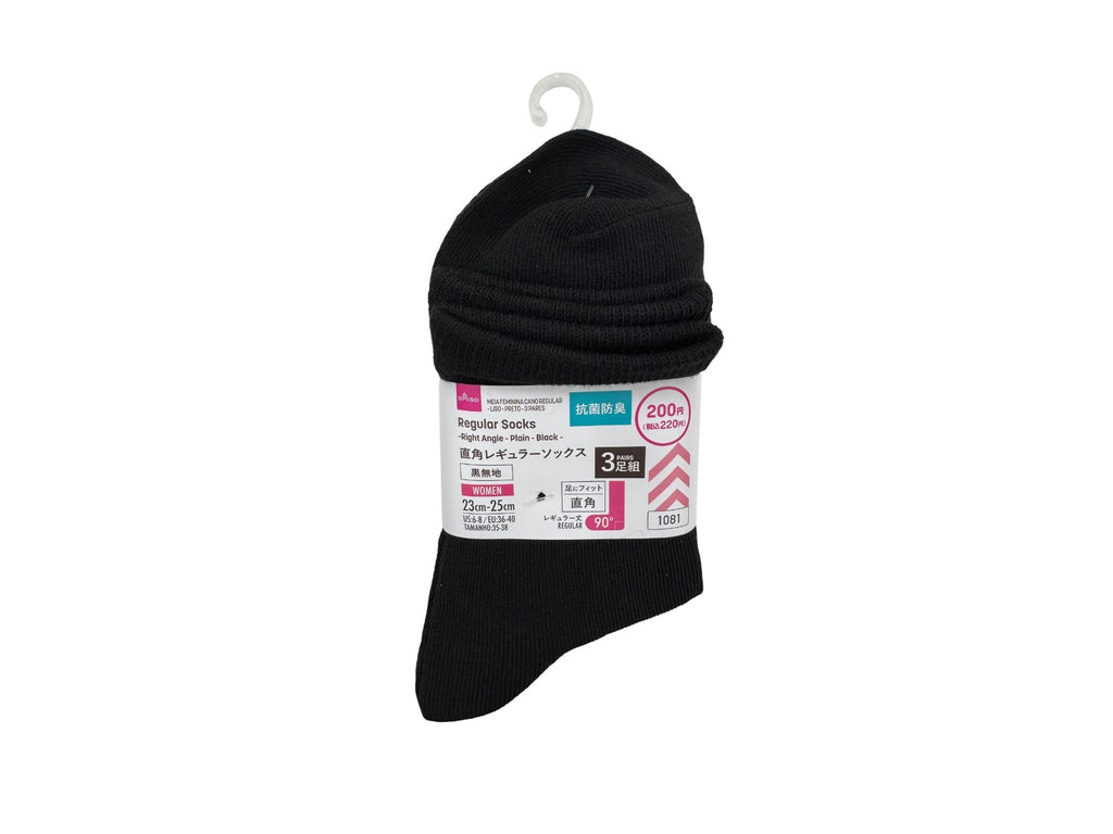 レディースレギュラーソックス(抗菌防臭、直角、無地、ブラック、3足組)