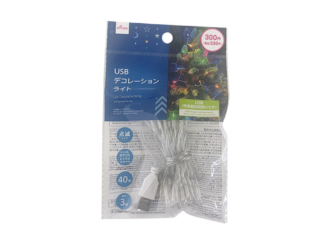 - 商品説明:●USB(充電器は別売りです)●ライトの色 カラフルミックス(赤・青・緑・黄)●長さ 3m●写真はイメージです。●LEDを使用したやさしい光で屋内を飾り付けます●電圧:5.0V●消費電流:0.074A●消費電力:0.37W●USBポートに正しい方向で挿入すると点灯します。●USBポートから抜くと消灯します。●給電にはACアダプター/モバイルバッテリーの出力DC5Vの物を使用してください。●※急速充電機器は使用しないでください。●※ACアダプターとモバイルバッテリーは付属しておりません。●※イラストはイメージです。●直射日光・高温多湿の場所を避けて、保管してください。●For_ages_15_and_up●光を直視しないでください。●LEDは熱を持つことがあります。使用中、使用直後は触らないでください。●光の色や明るさにばらつきが出る場合があります。●電球の交換はできません。●給電にはACアダプター・モバイルバッテリーの出力DC5Vの物を使用してください。●急速充電機器は_使用しないでください。●金属部分でケガをしないように、取り扱いに注意してください。●玩具ではありません。●長期間他の製品と密着させないでください。可塑剤の影
