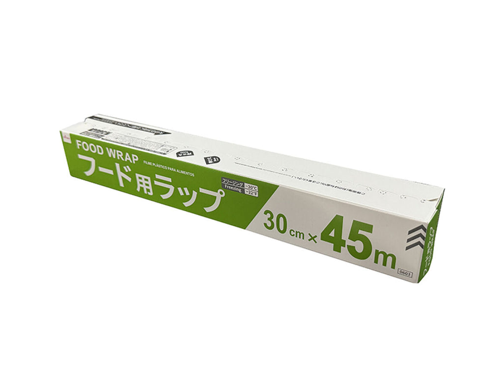 - 商品説明:サイズ:幅30cm_x_長さ45m_x_厚さ10μm_フリジング-30℃●写真はイメジです。レンジ_NO_オブン_NO_直火_NO_品名 食品包装用ラップフィルム_添加物名耐冷/耐熱温度:-30℃/110℃ラップを水平に引き出し、フタを閉じて◎マクを親指で押さえて、箱を内側に回します。_ラップを引き出した手はそのままで、箱を持つ手に力を入れて、刃の端からカットします。_※フタを開けたまま切らないでください。(カット)_ラップの正しい切り方_フタを閉じて切る_刃に注意_矢印の方向にお開けください。_押さえ_押し込んで使用できます_切る時の刃の位置_ご使用後(刃のはね返りにご注意ください。)●直射日光・高温多湿の場所を避けて、保管してください。●お子様の手の届かない場所に保管してください。ガス台の近くに置かないでください。_においの強いもの(洗剤、芳香剤)の近くに置かないでください。_乳幼児の手の届かない場所で使用・保管してください。誤って口に入れると、窒息の恐れがあります。_(ご使用後)のミシン目を持って引っ張ると紙と刃が一緒にはがれます。_注意:はがすときに刃がはね返りけがをすることがありますのでご注意ください。(顔から離してゆっく