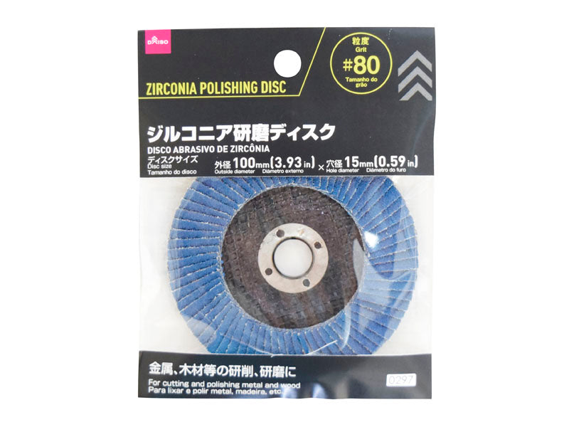 ディスクサイズ:外径100mm×穴径15mm 粒度#80 金属、木材等の研削、研磨に 最高周速度:4800m/min 最高回転数:15200_rpm 加工面に対して研磨ディスクを15°から30°傾けて使用してください。●使用する際は、安全メガネ、安全帽子、防塵マスク、作業用手袋を必ず着用してください。●最高回転数15200_rpmを超えて使用しないでください。●使用前に1分間の空転テストを行ってください。●引火危険物の近くで使用しないでください。●使用後は研磨物や製品が高熱を帯びますので、素手で触らないようにしてください。●無理な力や強い衝撃を与えないでください。●お子様の手の届かない場所で使用・保管してください。●直射日光・高温多湿の場所を避けて、使用・保管してください。●変形・破損した場合、直ちに使用を中止してください。●火や熱源のそばに置かないでください。●本来の用途以外に使用しないでください。