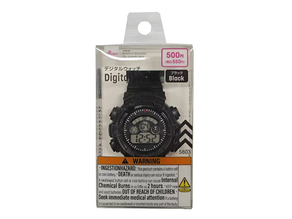 - 商品説明:デジタルウォッチ取扱説明書 非防水 ※この取扱説明書は大切に保管してください。 [現在時刻表示] 秒が進んでいる状態が現在時刻表示です。 A LⅠGHTボタンを押すと、LEDライトが点灯します。 B MODEボタンを押すと、1回:ストップウォッチ 2回:アラーム時刻設定 3回:現在時刻設定 4回:現在時刻表示に戻ります C STARTボタンを押すと、日付、曜日を表示します。 D RESETボタンを押すと、アラーム時刻を表示します。 平均月差:±60秒■現時刻の合わせ方 現在時刻を表示させます。 1 (B)ボタンを3回押します。【秒】が点滅します。 2 秒 【秒】が点滅している状態で(C)ボタンを押すと表示が00秒になります。※電話の時報などに合わせてください。 分 次に(D)ボタンを押して【分】を点滅させ、(C)ボタンを押して【分】を合わせます。 (C)ボタンを長押しすると、数字が連続して変わります。この機能は【分】【時】【日】【月】【曜日】の設定およびアラーム時刻の設定等に利用すると便利です。 時 次に(D)ボタンを押して【時】を点滅させ、(C)ボタンを押して【時】を合わせます。 ※→AM1