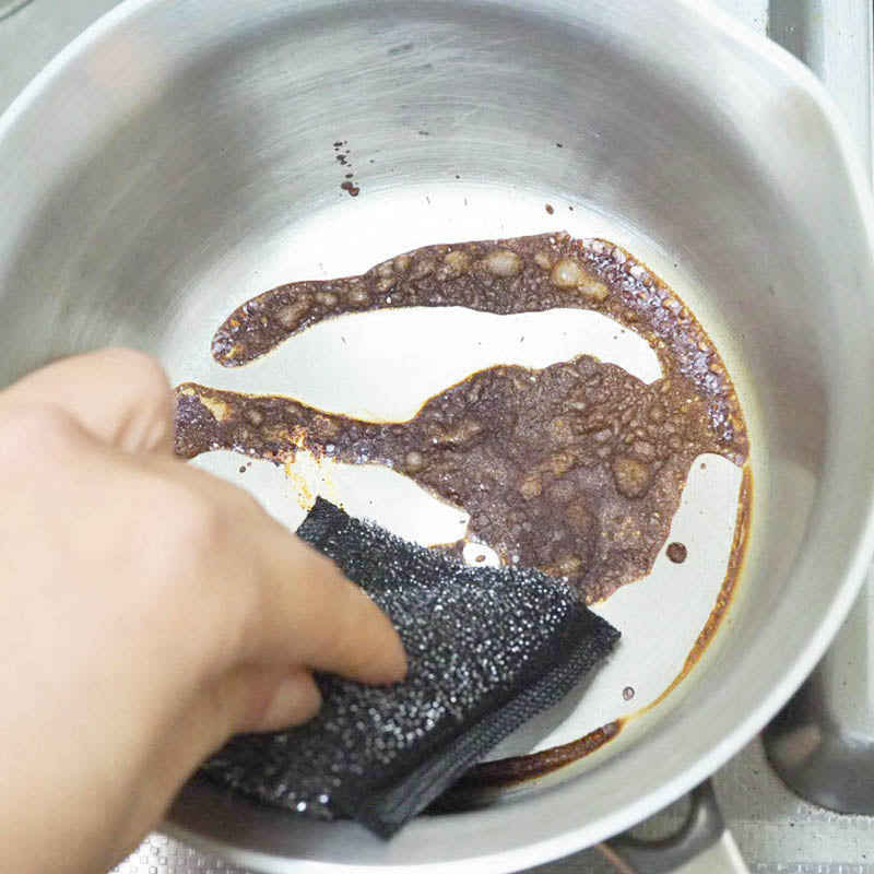 ●ステンレス繊維を編み込んでいるので、コゲつきやガンコな汚れをしっかり落とします。