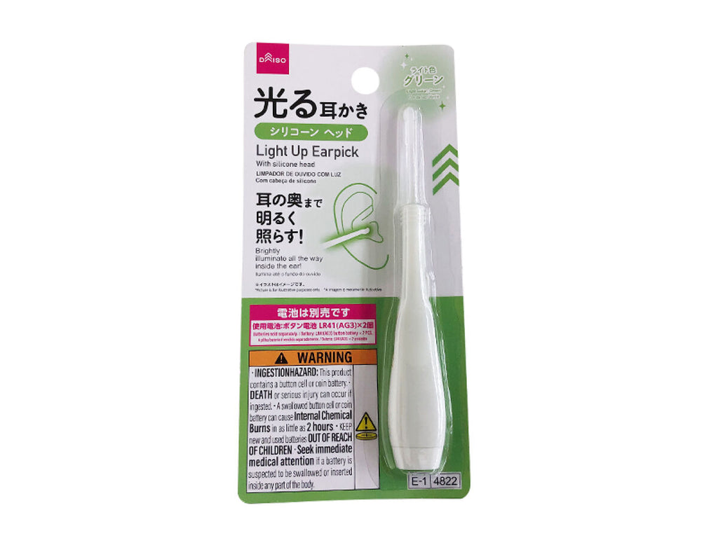 - 商品説明:耳の奥まで明るく照らす!●イラストはイメージです。シリコーンヘッド、ライト色:グリーン、先端のLED光が耳の奥まで明るく照らします。使用電池:ボタン電池(1.5V×2 3.0V 8.4mA)LR41(AG3)×2個●電池は別売りです。スイッチ、カバー、電池①電池カバーのネジをドライバーで外します。②電池の向きを確認し、正しくセットします。③スイッチを前方向にスライドさせて、光の点灯を確認してから、使用します。●使用後は、布などで拭いてください。●お子様の手の届かない場所に保管してください。●直射日光・高温多湿の場所を避けて、保管してください。●水洗いしないでください。●耳に疾患がある場合は使用しないでください。●耳を傷つけないよう、注意してください。●取り扱い注意●ボタン電池は飲み込むと危険です。●万一ボタン電池を飲み込んだ場合は、直ちに医師の診断を受けてください。●使用する際は、周囲の状況(ぶつかったりしないように)に注意してください。●お子様だけでの使用はやめてください。●新しい電池と古い電池、種類の違う電池を混ぜて使用しないでください。●電池はプラスマイナスを正しくセットしてください。●長期間使用しない