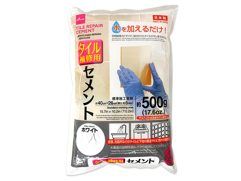 - 商品説明:※裏面の説明を読んでから使用してください。アスベストは含まれていません。●イラストはイメージです。水を加えるだけで使える初期接着力にすぐれ、タイルの貼り付けに最適。標準施工面積約40cm×26cm(厚さ:約5mm)ホワイト1袋 約500gで、約40cm×26cm(厚さ約5mm)が施工できます。浴室、洗面所などのタイルと下地の接着や、ヒビ割れの補修に。保管状況により本品が硬くなってしまった場合は使用しないでください。●お子様の手の届かない場所に保管してください。●直射日光・高温多湿の場所を避けて、保管してください。●セメントは強アルカリ性です。●使用する際は、保護具(マスク、ゴム手袋、保護メガネなど)を着用してください。●凍結の恐れがある時(5℃以下)は施工しないでください。●目に入った場合は水で洗い流し、医師に相談してください。●本来の用途以外に使用しないでください。