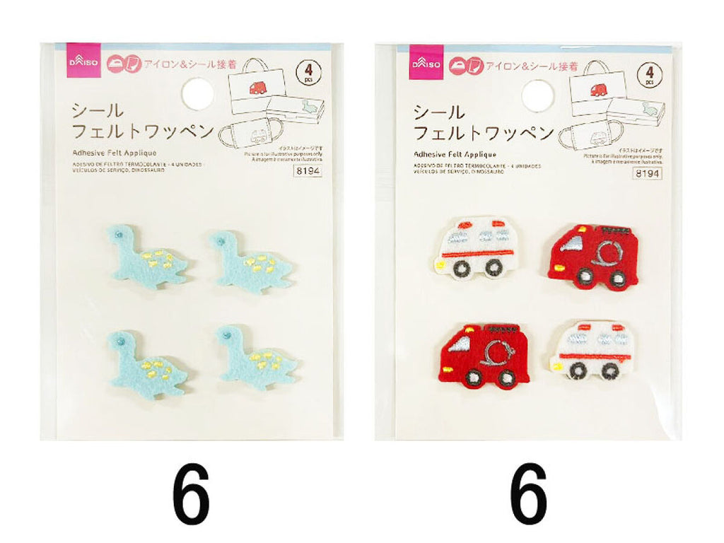シールフェルトワッペン(4個、はたらくのりもの、ダイナソー)