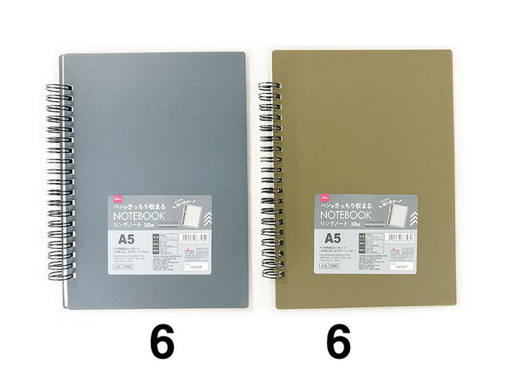ペンが挟めるリングノート(30枚、A5、モスグリーン、ブルー)