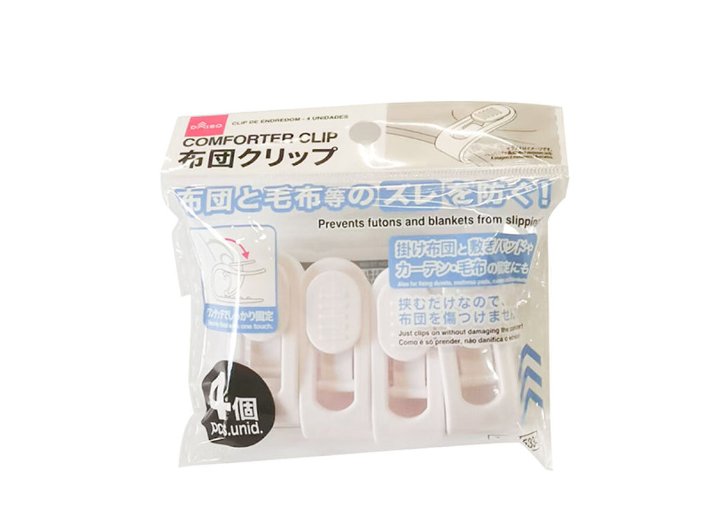 - 商品説明:4個セット用途に合わせてお好みに!挟むだけなので、布団を傷つけません!布団と毛布等のズレを防ぐ! 掛け布団と敷きパッドやカーテン・毛布の固定にも ワンタッチでしっかり固定●イラストはイメージです。①クリップのつまみをあげます。 ②空いた部分に布団を通します。 ③クリップのつまみを戻します。 ④クリップを外す際は、クリップと布団の隙間に指を入れると簡単に外せます。●火や熱源のそばに置かないでください。●たわし、又はクレンザーは使用しないでください。●落とす、ぶつける等の強い衝撃を与えないでください。●直射日光・高温多湿の場所を避けて、使用・保管してください。●変形・破損した場合、直ちに使用を中止してください。●本来の用途以外に使用しないでください。