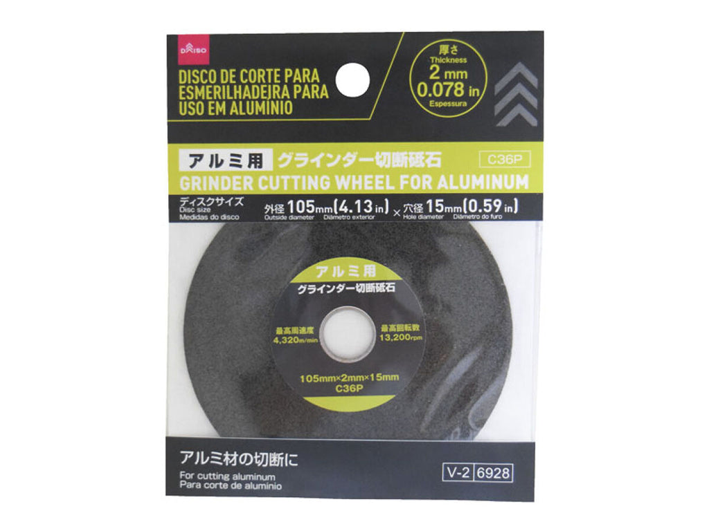 - 商品説明:ディスクサイズ 外径105mm×穴径15mm C36P 厚さ 2mm アルミ材の切断に 最高周速度:4320_m/min 最高回転数:13200_rpm 材料に対して表面に当てる程度の力加減で作業してください。 グラインダーの背が右側にくるように構えて作業してください。●使用する際は、安全メガネ、安全帽子、防塵マスク、作業用手袋を必ず着用してください。●最高回転数13200_rpmを超えて使用しないでください。●使用前に1分間の空転テストを行ってください。●引火危険物の近くで使用しないでください。●使用後は研磨物や製品が高熱を帯びますので、素手で触らないようにしてください。●グラインダーの砥石カバーを装着してください。●砥石の側面は使用しないでください。●無理な力や強い衝撃を与えない●子どもの手の届かない場所で使用・保管●直射日光・高温多湿を避け使用・保管●変形・破損時は使用中止●火や熱源のそばに置かない●用途外に使用しない