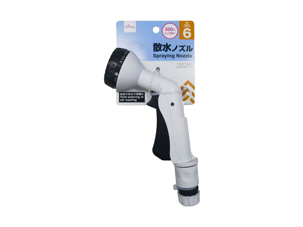 取り付け方法_1コネクターからホースロックホルダーを外します。_2ホースロックホルダーにホースを通します。_3ホースをホースホルダーの内側に奥まで差し込みます。_4ホースホルダーをしっかりと締めてください。_5コネクターをカチッと音がするまで本体に差し込んでください。_本体_コネクター_ホースホルダー_ホースロックホルダー_トリガーキャッチ_トリガー_水形_キリ_ジェット_ストレート_横拡散_シャワー中_シャワー外お庭の散水や洗車に6種切り替え_冬期は凍結破損防止のためノズル、ホースの水を充分出し切って保管してください。万一凍結した場合は、無理に使用しないでください。破損の原因となります。●お子様の手の届かない場所に保管してください。本品は散水専用です。_水以外のものは使用しないでください。_耐圧ホースを使用してください。_使用後(散水現場を離れる場合など)は必ず蛇口を閉めて水を止めてください。漏水する恐れがあります。●本来の用途以外に使用しないでください。●お子様の手の届かない場所で使用・保管してください。
