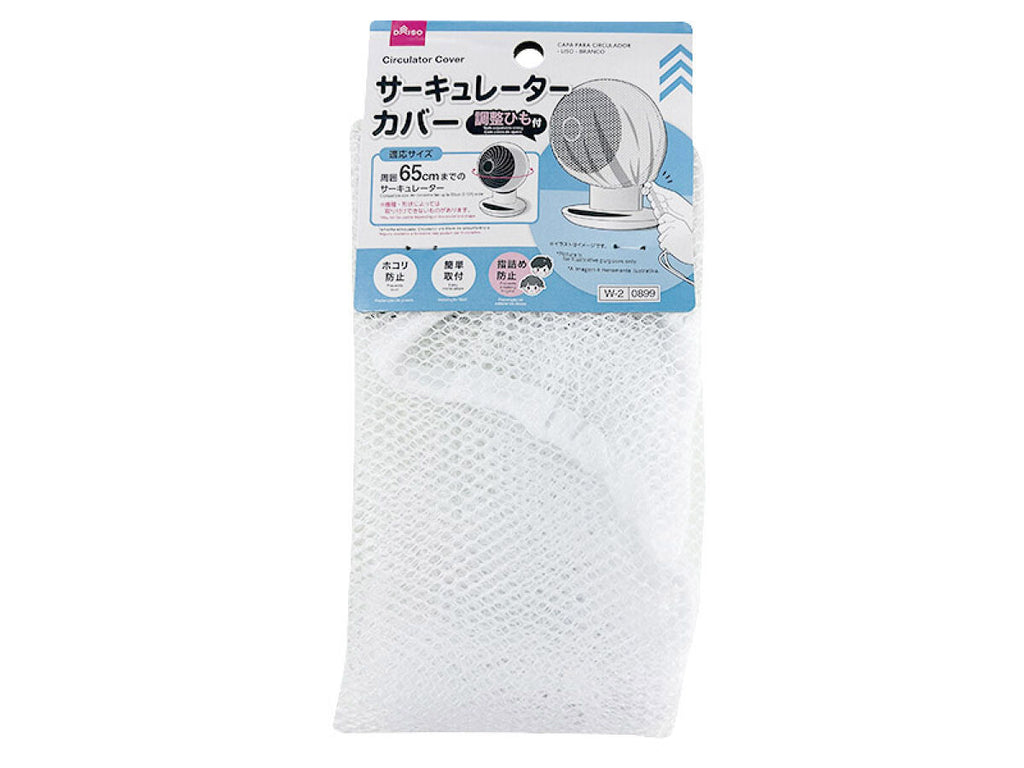 - 商品説明:調整ひも付 ホコリ防止 簡単取付 指詰め防止●イラストはイメージです。適応サイズ:周囲65cmまでのサーキュレーター ※機種・形状によっては取り付けできないものがあります。 周囲65cmまで取付方法 ①サーキュレーターの電源を切り、ヘッドに本品をかぶせる ②ひもを絞り調整する ③余ったひもを巻き込まないようコンパクトに結ぶ●サイズが合わない場合は使用しないでください。 ●サーキュレーターの形状によっては取り付けできない場合があります。 ●サーキュレーターの形状によってはネットのたるみが生じます。 ●サイズや形状によっては背後まで完全にカバーできません。 ●脱着の際はサーキュレーターの電源を切ってください。●火や熱源のそばに置かないでください。●本来の用途以外に使用しないでください。