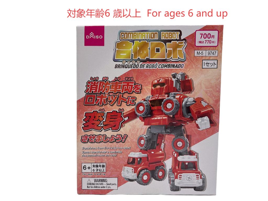 - 単品サイズ:クレーン車:11×6.5×11cm、はしご車:11×6.5×11cm、ショベルカー:11×7.5×13cm、ボンプ車①:11×6.5×9cm、ボンプ車②:11×6.5×8.5cm、ドライバー:1.2×7.7×1.2cm、ねじ:1×1.8×1cm、ロボット(組み立てサイズ):27×18×13cm