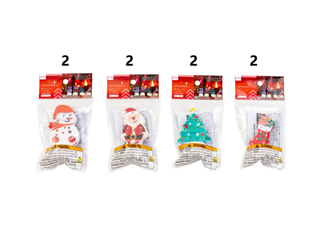 - 単品サイズ:スノーマン:D3.8cm×W4.25cm×H8.25cm、サンタクロース:D3.8cm×W4.25cm×H8.0cm、サンタツリー:D3.8cm×W5.25cm×H7.8cm、サンタソックス:D3.8cm×W5.0cm×H6.7cm