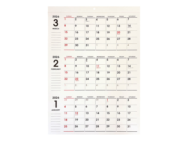2026年カレンダー(B3、3ヶ月綴り、シンプル)なし