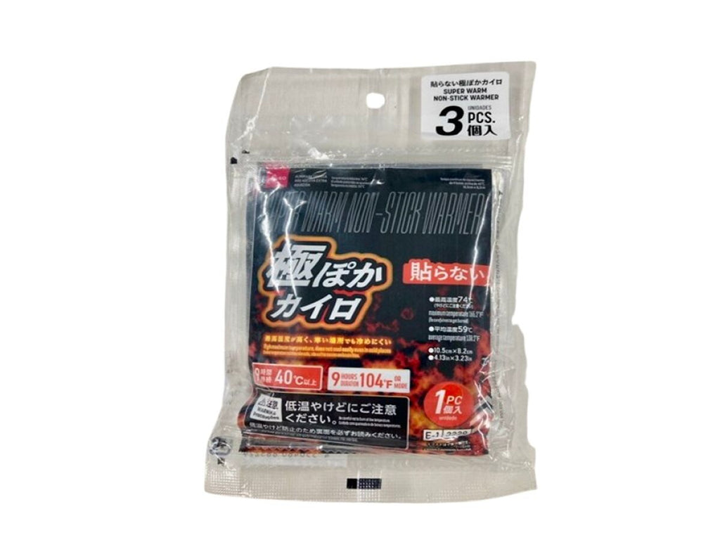- 商品説明:最高温度が高く、寒い場所でも冷めにくい切り口(ハサミを使わないでください。)有効期限:枠外に記載_品名:使い捨てカイロ_持続時間9時間:40℃以上 _最高温度74℃_平均温度59℃_たて10.5cm×よこ8.2cm_3個入内装は使用直前に開封し、ポケットなどに入れて使用してください。_もまずに衣類の上から使用してください。_肌に直接触れないように使用してください。_1個入_3個入●直射日光・高温の場所を避けて、保管してください。●乳幼児の手の届かない場所に保管してください。低温やけどは体温より高い温度の発熱体を長時間あてていると紅斑、水泡などの症状をおこすやけどのことです。自覚症状をともなわない低温やけどになる場合もありますので、ご注意ください。_就寝時は低温やけどをしやすいので、使用しないでください。屋内での使用はしないでください。_お子様や体の不自由な方、皮膚の弱い方などが使用される場合は、特にご注意ください。_使用後は市町村の区分に従ってお捨てください。_1時間に1回程度、肌の状態を確認してください。異常が認められる場合は、ただちに使用を中止してください。_直接肌に触れないように使用してください。_糖尿病など温感お