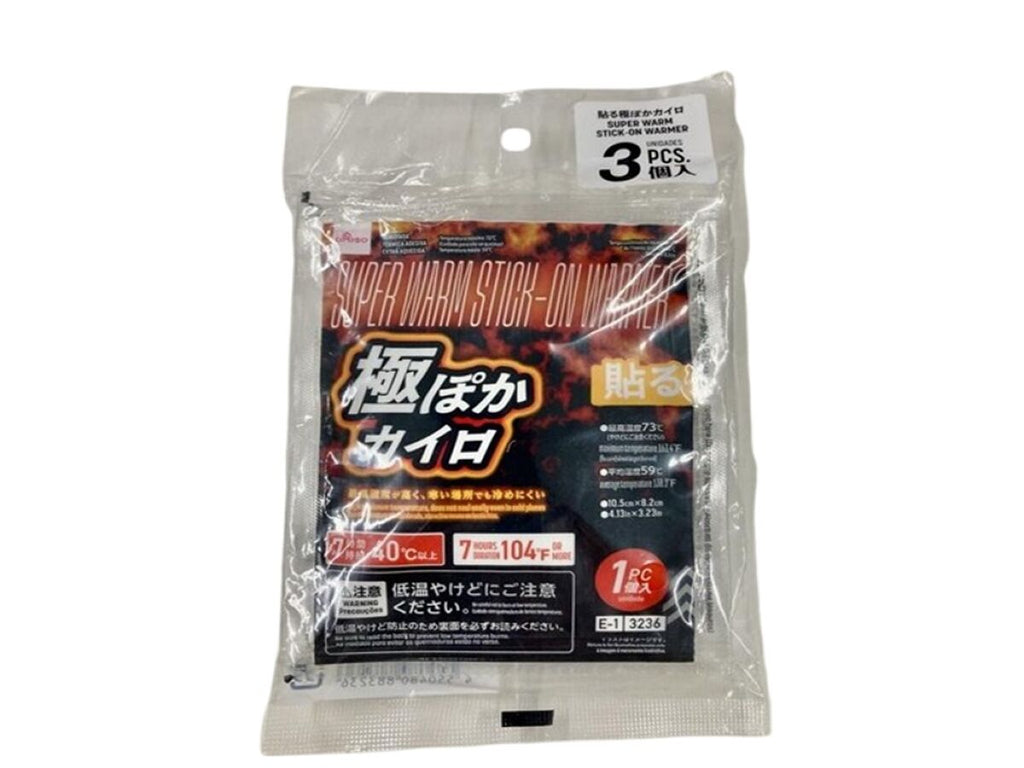 - 商品説明:最高温度が高く、寒い場所でも冷めにくい切り口(ハサミを使わないでください。)有効期限:枠外に記載_品名:使い捨てカイロ_持続時間7時間:40℃以上 _最高温度73℃_平均温度59℃_たて10.5cm×よこ8.2cm_3個入内装は使用直前に開封し、はく離をはがして使用してください。_もまずに衣類に貼って使用してください。_肌に直接貼らないでください。_粘着剤で傷む衣類や高級な衣類には使用しないでください。衣類よりはがす時は衣類などが傷まないように注意の上、ゆっくりはがしてください。_1個入_3個入●直射日光・高温の場所を避けて、保管してください。●乳幼児の手の届かない場所に保管してください。低温やけどは体温より高い温度の発熱体を長時間あてていると紅斑、水泡などの症状をおこすやけどのことです。自覚症状をともなわない低温やけどになる場合もありますので、ご注意ください。_就寝時は低温やけどをしやすいので、使用しないでください。屋内での使用はしないでください。_お子様や体の不自由な方、皮膚の弱い方などが使用される場合は、特にご注意ください。_使用後は市町村の区分に従ってお捨てください。_1時間に1回程度、肌の状態を確認してください