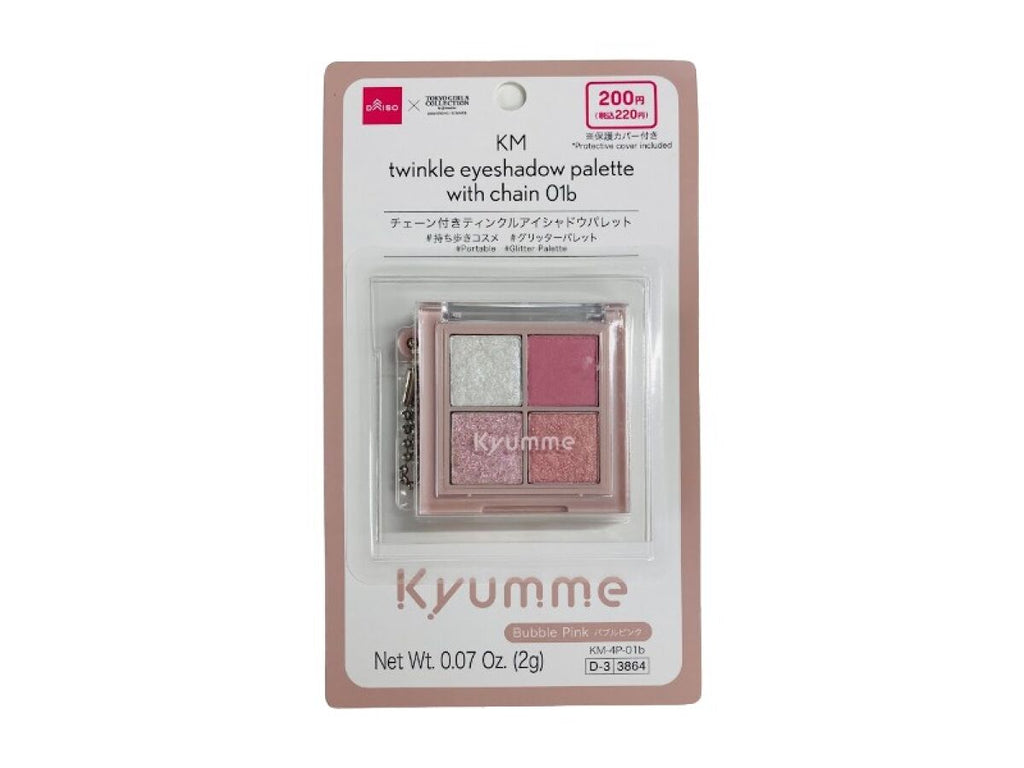 - 商品説明:チェーン付きティンクルアイシャドウパレット_#持ち歩きコスメ_#グリッターパレット_バブルピンク_Net.Wt._0.07_Oz_2g_KM 4P 01bアイシャドウバッグなどに付けられるチェーン付きアイシャドウ。_4色パレットで、様々な組み合わせで自由なアレンジが楽しめます。お手持ちのブラシやチップ、または指先に適量をとり、まぶたに軽くのばします。_グリッターはチップなどで軽くとりながら、まぶたにポンポンとのせるようにご使用ください。_※持ち運ぶ際は、チェーンが正しく留まっているか、蓋がしっかり閉まっているかよくご確認の上、付属のカバーを必ずつけてご使用ください。_●肌に異常が生じていないかよく注意して使う。肌に合わない時や、使用中、赤味、はれ、かゆみ、刺激、色抜け(白斑等)や黒ずみ等の異常が出た時、また、日光があたって同じような異常が出た時は、使用を中止して皮膚科医へ相談する。使い続けると症状が悪化する場合がある。●傷やはれもの、しっしん等、異常のある部位には使わない。●目に入らないよう注意。●落下等の衝撃に注意。●使用後はしっかり蓋をしめる。●乳幼児の手の届かないところに保管。●極端に高温又は低温の場所、直射日光