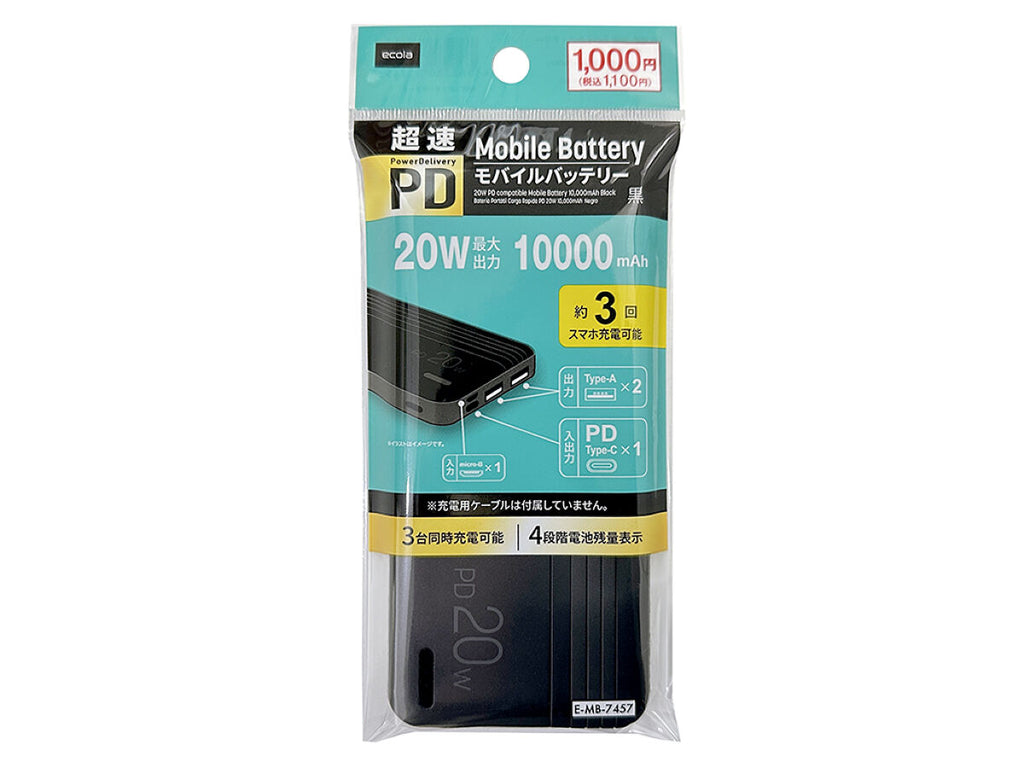 PD対応 20W モバイルバッテリー 10000mAh 黒