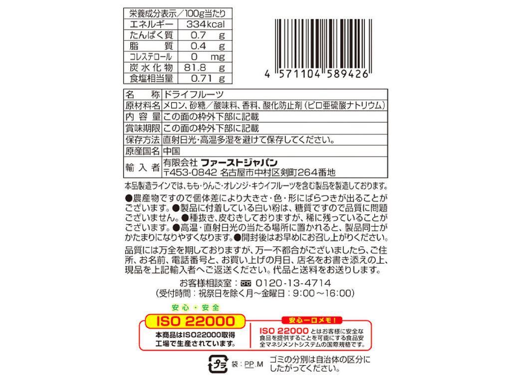 外側はサクッとした食感で内側は口当たりの良いしっとり柔らかな優しい食感に仕上げ、メロンの特徴でもある上品で芳醇な香りを手軽に楽しめる半生タイプのドライフルーツです