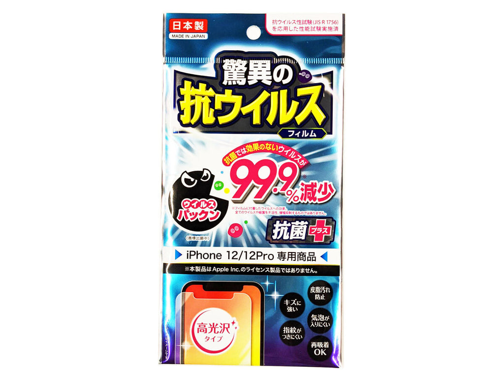 - 商品説明:●iPhone_12_12Pro専用商品●本品は_Apple_Inc_のライセンス製品ではありません。●※抗ウイルス性試験_JIS_R_1756_に準じた性能試験実施済●抗ウイルスフィルム●●抗菌では効果のないウイルスが99_9_減少●ウイルスパックン●抗菌プラス●※フィルムに付着したウイルスへの効果。●全てのウイルスや細菌を不活性、増殖抑制するものではありません。●高光沢タイプ●写真・イラストはイメージです。●本品はiPhone_12_12_Pro専用の抗ウイルス液晶画面保護フィルムです。●iPhoneは_Apple_Inc_の商標または登録商標です。●フィルムサイズ●143_mm_×_68_mm●抗ウイルス性試験の結果●エンベロープ無し●エンベロープ有り●試験規格_JIS_1756●※上記データは測定値であり、保証値ではありません。●?液晶画面についた汚れやほこりを付属のクロスで拭き取ってください。●?位置を確認したら、剥離フィルムを剥がしながら端からゆっくり貼り付けてください。●大きな気泡が入った場合にはゆっくりと空気を押し出すか、再度貼り直してください。●本品はiPhone_12_12_Pro専用です。iPhone_12_12_Pro以外の製品は使用できません。●本品は液晶画面を完全に保護するものではありま