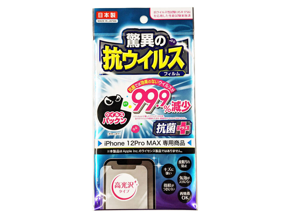 - 商品説明:●iPhone_12Pro_MAX専用商品●本品は_Apple_Inc_のライセンス製品ではありません。●※抗ウイルス性試験_JIS_R_1756_に準じた性能試験実施済●抗ウイルスフィルム●●抗菌では効果のないウイルスが99_9_減少●ウイルスパックン●抗菌プラス●※フィルムに付着したウイルスへの効果。●全てのウイルスや細菌を不活性、増殖抑制するものではありません。●高光沢タイプ●写真・イラストはイメージです。●本品はiPhone_12Pro_MAX専用の抗ウイルス液晶画面保護フィルムです。●iPhoneは_Apple_Inc_の商標または登録商標です。●フィルムサイズ●157_mm_×_74_mm●抗ウイルス性試験の結果●エンベロープ無し●エンベロープ有り●試験規格_JIS_1756●※上記データは測定値であり、保証値ではありません。●?液晶画面についた汚れやほこりを付属のクロスで拭き取ってください。●?位置を確認したら、剥離フィルムを剥がしながら端からゆっくり貼り付けてください。●大きな気泡が入った場合にはゆっくりと空気を押し出すか、再度貼り直してください。●本品はiPhone_12Pro_MAX専用です。iPhone_12Pro_MAX以外の製品は使用できません。●本品は液晶画面を完全に保護するものではあり