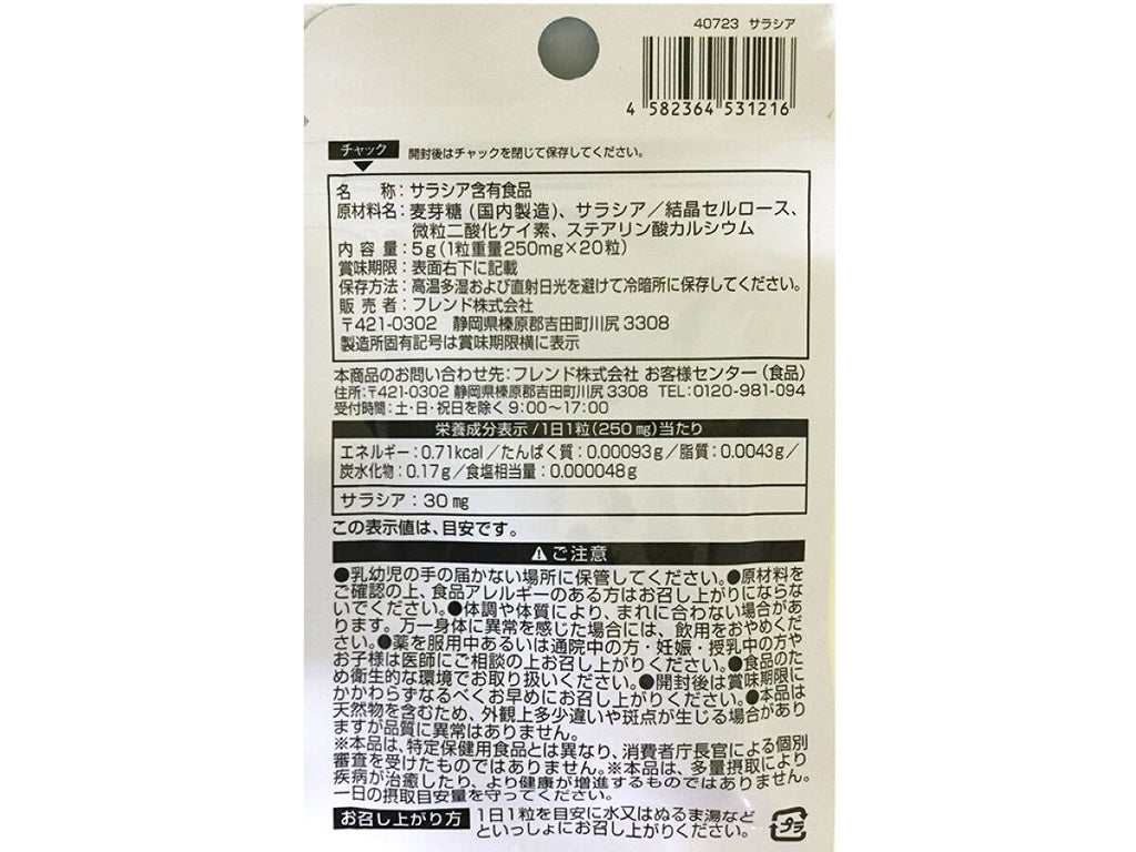 内_容_量:5g(1粒重量250mg×20粒)_栄養成分表示/1日1粒(250_㎎)当たり_エネルギー:0.71kcal_/たんぱく質:0.00093g/_脂質:0.0043g/炭水化物:0.17g/食塩相当量:0.000048g_サラシア:30_㎎_この表示値は、目安です。