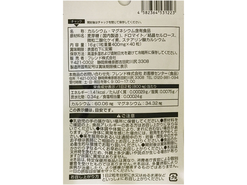 内_容_量:16g(1粒重量400mg×40_粒)_栄養成分表示/1日2_粒(800_㎎)当たり_エネルギー:1.41kcal_/たんぱく質:0.00029g/脂質:0.0075g/_炭水化物:0.3_4g/食塩相当量:0.00024g_カルシウム:60.06_㎎ マグネシウム:34.32_㎎_この表示値は、目安です。
