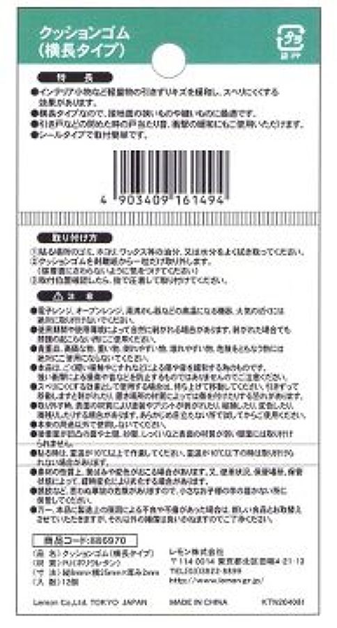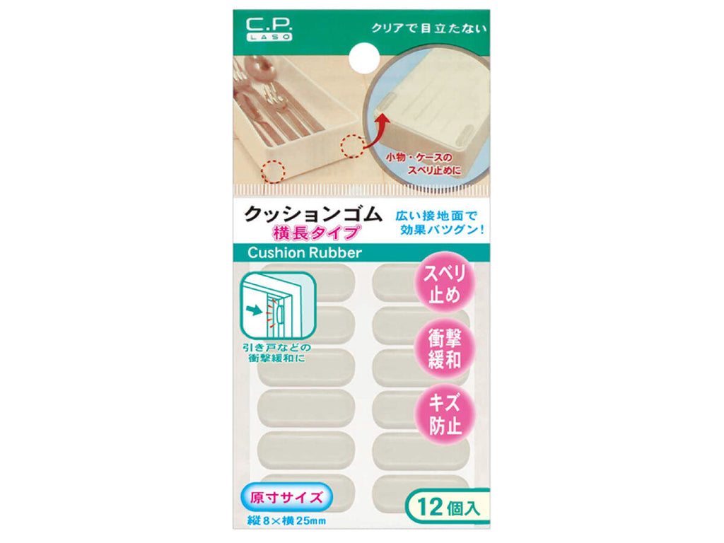 - 商品説明:インテリア小物のスベリ止めや引きずりキズを緩和し、スベリにくくします。接地面の狭いものや、小さいものに最適な横長タイプです。小物などのスベリ止め用インテリア小物などの軽量物の引きずりキズを緩和し、スベリにくくする効果があります。引き戸等の閉めた時の戸当たり音、衝撃の緩和にもご使用いただけます。接地面の狭いものや小さいものに最適な横長型です。シールタイプなので取り付け簡単です。貼る場所のゴミ、ホコリ、ワックス等の油分、または水分をよくふき取ってください。クッションゴムを剥離紙から一粒だけ取り外します。接着面に触らないようにご注意ください。取り付け位置を確認したら、指で圧着して取付けてください。誤飲など、思わぬ事故の危険がありますので、小さなお子様の手の届くところに保管・放置しないでください。電子レンジ オーブンレンジ。湯沸かし器などの高温になる機器 火気の近くには絶対に取り付けないでください。使用期間や使用環境によって、自然に剥がれる場合があります。剥がれても問題の起こらない所にご使用ください。貴重品、高価なもの、重いもの、倒れやすいもの、壊れやすいもの、危険をともなうものには使用しない