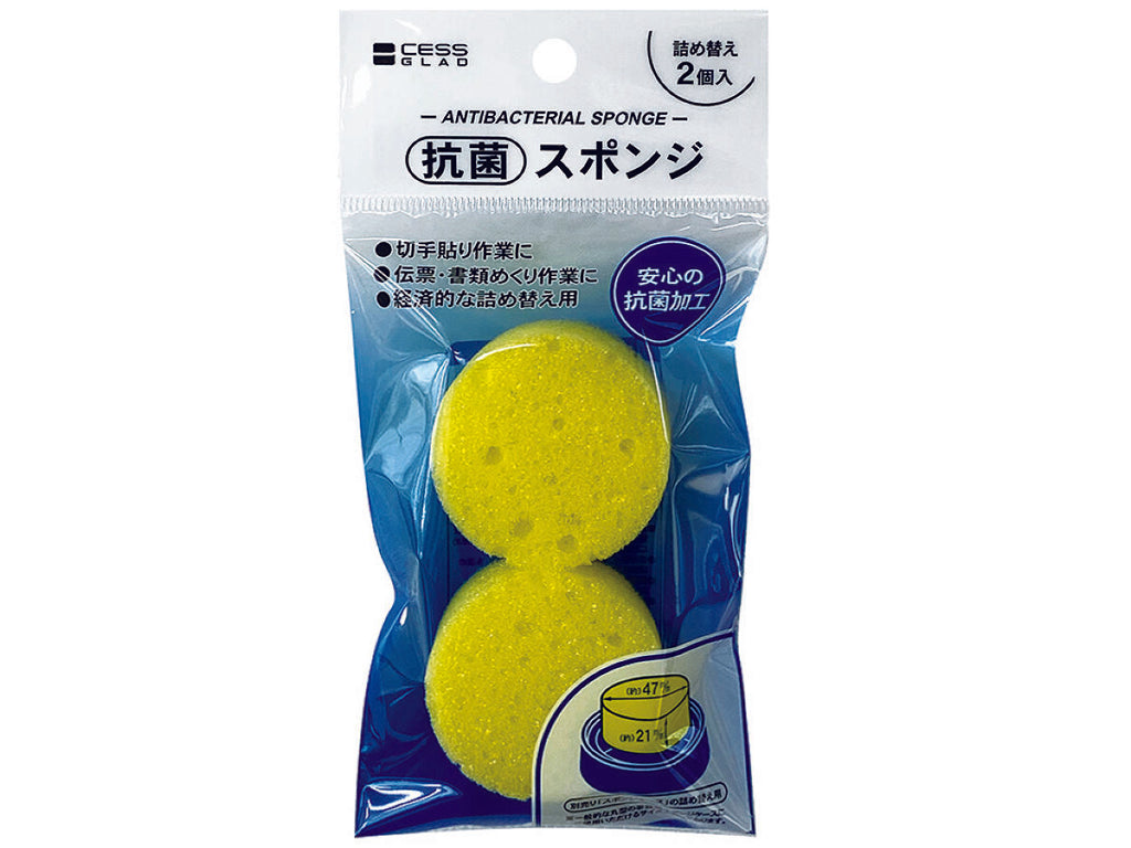 - 商品説明:スポンジケスの詰め替え用 _安心の抗菌加工切手貼り作業_お札・伝票・書類めくり作業に一般的な丸型の事務用スポンジケスにご使用いただけるサイズとなっています。_黄色ブドウ球菌や大腸菌の増殖や活性を抑制する抗菌加工が施されたスポンジです。一般的な丸型の事務用スポンジケスの中にスポンジを入れて_スポンジに水を含ませてください。_書類めくりなどの事務作業時に指を水に浸したスポンジにつけて_書類等をめくってください。_清潔にお使いいただくために、スポンジの水は定期的に交換してください。使用後は十分にスポンジを乾燥させてください。高温多湿の場所を避けて保管してください。_火気のある所、高温になる所に近づけたり放置したりしないでください。小さなお子様の手の届く所に保管・放置しないでください。抗菌加工は、スポンジに付着した細菌の増殖を抑制するものですが、_滅菌・除菌できるものではありません。_又、すべての細菌への効果を保障するものではありません。_スポンジに付着した汚れや、汚れに発生した細菌には効果はありません。清潔にお使いいただき、水はこまめに取り換えてください。_書類目クリや、水濡らし以外でのご使用はお避け下