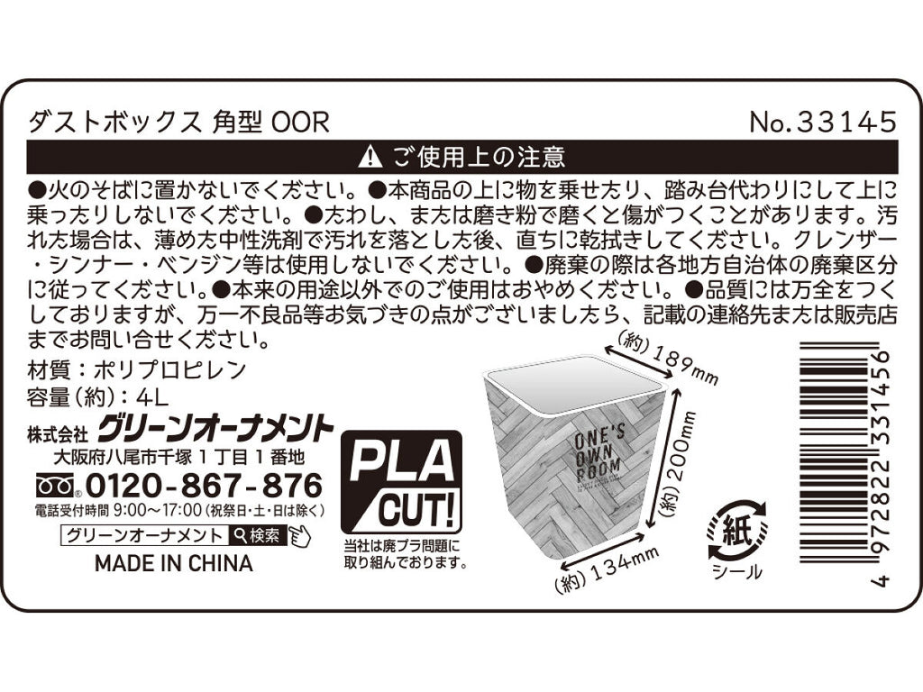 - 商品説明:容量約4リットル角型ダストボックス 汚れた場合は薄めた中性洗剤で汚れを落とした後、直ちに乾拭きしてください。小さなお子様の手の届かないところに保管してください。●火のそばに置かないでください。●本商品の上に物を乗せたり、踏み台代わりにして上に乗ったりしないでください。●たわし、または磨き粉で磨くと傷が付く事があります。クレンザー・シンナー・ベンジン等は使用しないでください。●廃棄の際は各地方自治体の廃棄区分に従ってください。●本来の用途以外でのご使用はおやめください。●品質には万全をつくしておりますが、万一不良品などお気づきの点がございましたら、記載の連絡先または販売店までお問い合わせください。