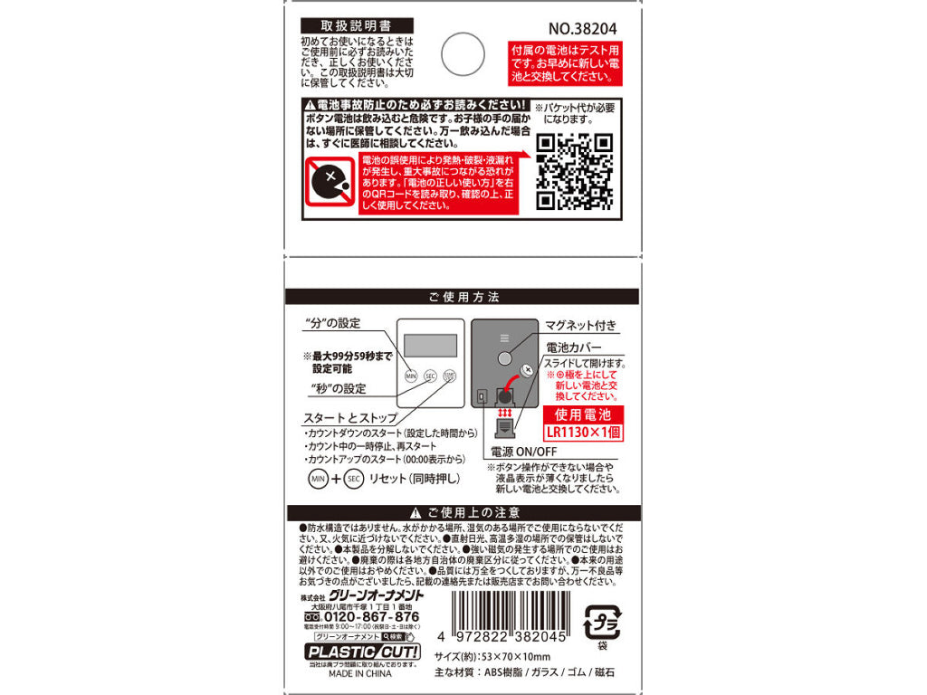 - 商品説明:設定簡単、表示が見やすいタイプ。マグネット付き。料理、勉強、美容、運動や仕事などの時間管理に対応できます。3キーボタンの操作、簡単に使えます。お子様の手の届かない所に保管してください。●ボタン電池の誤飲に注意、子供の手の届かない場所に保管。誤飲した場合はすぐに医師へ相談。_●電池はショートさせたり、充電、分解、加熱、火の中に入れたりしないでください、●長期間使用しない場合は電池を外してください、_●本品は防水仕様ではありません、●直射日光・高温の場所を避けて、保管してください、●分解や改造をしないでください、_●本来の用途以外に使用しないでください、_●申し訳ございません生産に万全を期しておりますが、万一不良の場合にはお買い上げ店にてお取り替えさせていただきます。本品使用目的以外の使用に起因するなど、本品の欠陥に基づかない損害については当社では責任を負いかねます。あらかじめご了承の上お買い求めください。