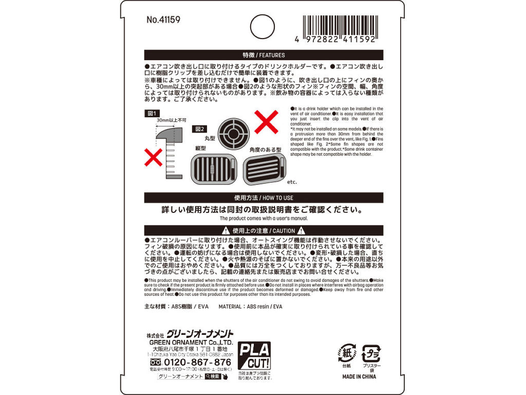 - 商品説明:エアコン吹き出し口に取り付けるタイプのドリンクホルダーです。エアコン吹き出し口に樹脂クリップを差し込むだけで簡単に装着できます。エアコンの送風によってドリンクを保冷、保温できます。クリップを本体裏の差込口に取り付けます。クリップをフィンの奥まで差し込み、フィンにしっかりと引っ掛けます。本体が水平になるようにスライドパーツを調節します。直射日光、高温の場所をさけて、保管してください。小さなお子様の手の届かないところに保管してください。●エアコンルーバーに取り付けた場合、オートスイング機能は作動させないでください。フィン破損の原因になリます。●使用前に本品が確実に取り付けられている事を確認してください。●運転の妨げになる場合は使用しないでください。●変形o破損した場合、直ちに使用を中止してください。●火や熱源のそばに置かないでください。●本来の用途以外でのご使用はおやめください。●品質には万全をつくしておりますが、万一不良品等お気づきの点がございましたら、記載の連絡先または販売店までお問い合せください。