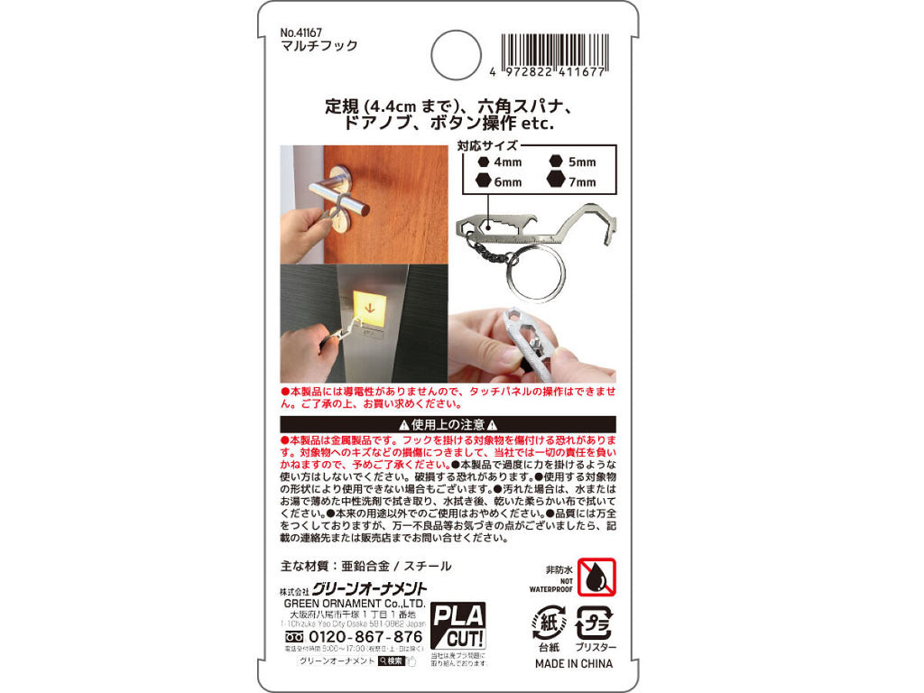- 商品説明:アシストフック_電車接触感染対策_触らない_触れない_銅_守る_感染防止策アシストフック_電車接触感染対策_触らない_触れない_銅_守る_感染防止策電車、バスの吊り手、縦手すりなどに直接触ること無く、フックを掛け、掴まる事が出来ます。またエスカレーターの手すり、レバーが付いたドアノブ、エレベーターボタンも操作可能です。定規、レンチの操作も可能です。本製品を持って、ドアや、エレベータなどを押す直射日光に当たる場所に置かないでください。●本製品は金属製品です。フックを掛ける対象物を傷付ける恐れがあります。対象物へのキズなどの損傷につきまして、当社では一切の責任を負いかねますので、予めご了承ください。●本製品で過度に力を掛けるような使い方はしないでください。破損する恐れがあります。●使用する対象物の形状により使用できない場合もございます。●汚れた場合は、水またはお湯で薄めた中性洗剤で拭き取り、水拭き後、乾いた柔らかい布で拭いてください。●本来の用途以外でのご使用はおやめください。●品質には万全をつくしておりますが、万一不良品等お気づきの点がございましたら、記載の連絡先または販売店までお問い合せください。