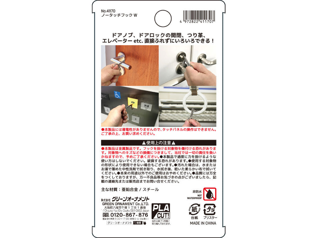 - 商品説明:アシストフック_エレベーター 電車接触感染対策_触らない_触れない_銅_守る_感染防止策アシストフック_エレベーター 電車接触感染対策_触らない_触れない_銅_守る_感染防止策電車、バスの吊り手、縦手すりなどに直接触ること無く、フックを掛け、掴まる事が出来ます。またエスカレーターの手すり、レバーが付いたドアノブ、栓抜き、エレベーターボタンも操作可能です本製品を持って、ドアや、エレベータなどを押す直射日光に当たる場所に置かないでください。●本製品は金属製品です。フックを掛ける対象物を傷付ける恐れがあります。対象物へのキズなどの損傷につきまして、当社では一切の責任を負いかねますので、予めご了承ください。●本製品で過度に力を掛けるような使い方はしないでください。破損する恐れがあります。●使用する対象物の形状により使用できない場合もございます。●汚れた場合は、水またはお湯で薄めた中性洗剤で拭き取り、水拭き後、乾いた柔らかい布で拭いてください。●本来の用途以外でのご使用はおやめください。●品質には万全をつくしておりますが、万一不良品等お気づきの点がございましたら、記載の連絡先または販売店までお問い合せくださ