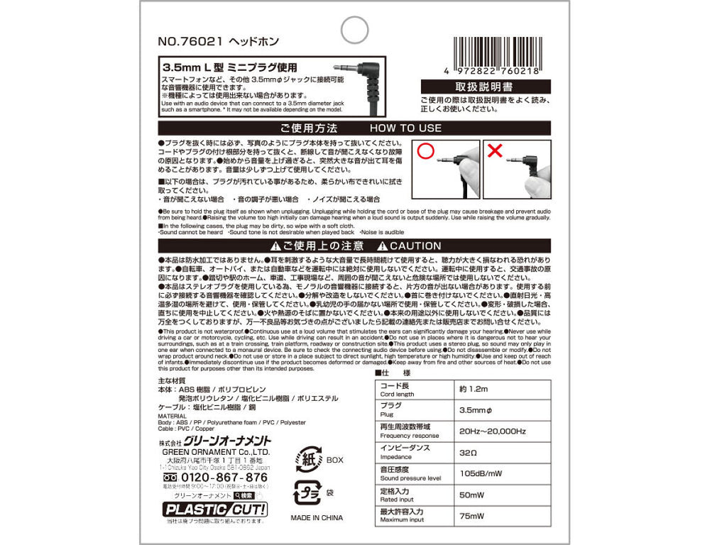 - 商品説明:3.5mmジャック、絡みにくい平形コートで長さ約1.2メートル、密閉型で音圧感度105dp、再生周波数帯20から20000Hz、インピーダンス32Ω、レスポンスに優れた密閉型ヘッドホン。長時間の装着でも疲れにくいつくりです。3.5mmジャックのPCやスマホに対応できます。お子様に届かないところに保管してください。●本品は防水加工ではありません。●耳を刺激するような大音量で長時間続けて使用すると、聴力が大きく損なわれる恐れがあります。●自転車、オートバイ、または自動車などを運転中には絶対に使用しないでください。運転中に使用すると、交通事故の原因になります。●踏切や駅のホーム、車道、工事現場など、周囲の音が聞こえないと危険な場所では使用しないでください。●本品はステレオプラグを使用している為、モノラルの音響機器に接続すると、片方の音が出ない場合があります。使用する前に必ず接続する音響機器を確認してください。●分解や改造をしないでください。●首に巻き付けないでください。●直射日光・高温多湿の場所を避けて、使用・保管してください。●乳幼児の手の届かない場所で使用・保管してください。●変形・破損した場合、直ちに使用を中止して