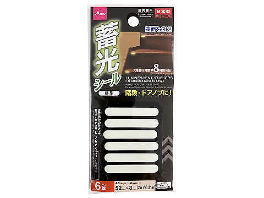 - 商品説明:光を蓄え暗闇で8時間発光 ※JIS_Z917による測定結果です。 非常時・日常時の目印に! 光る 屋内専用 ※写真はイメージです。 まず光を3分以上、蓄えてから使用してください。 水まわり使用不可 階段に ドアノブ・引き戸に 時間によるりん光輝度の変化 ※表の数値は照度2ルクスの光源を、商品に2分間照射した場合の測定値であって保証値ではありません。 りん光輝度(mcd/㎡) 残光時間(分) 輝度と明るさの目安 ※当社実験結果 【5mcd/㎡以上】非常に明るくはっきり確認できる。 【3mcd/㎡】物の輪郭まで確認できる程度。 【2mcd/㎡】薄くぼやけて、何とか確認する事ができる程度。【1mcd/㎡以下】ほとんど確認できない。 太陽光や蛍光灯などの光を3分以上当ててから使用してください。暗闇での発光が8時間持続します。暗闇で保管していたシールを貼り付けても発光しません。(但し、残光時間は周囲の明るさ、目の暗順応、距離などに左右され、輝度は時間の経過に伴い低くなります。)周囲の明るさにより、発光を確認できる時間は異なります。 接着面のホコリ、油分、水分を拭き取ってから使用してください。 肌に貼らないでください。 水分や油